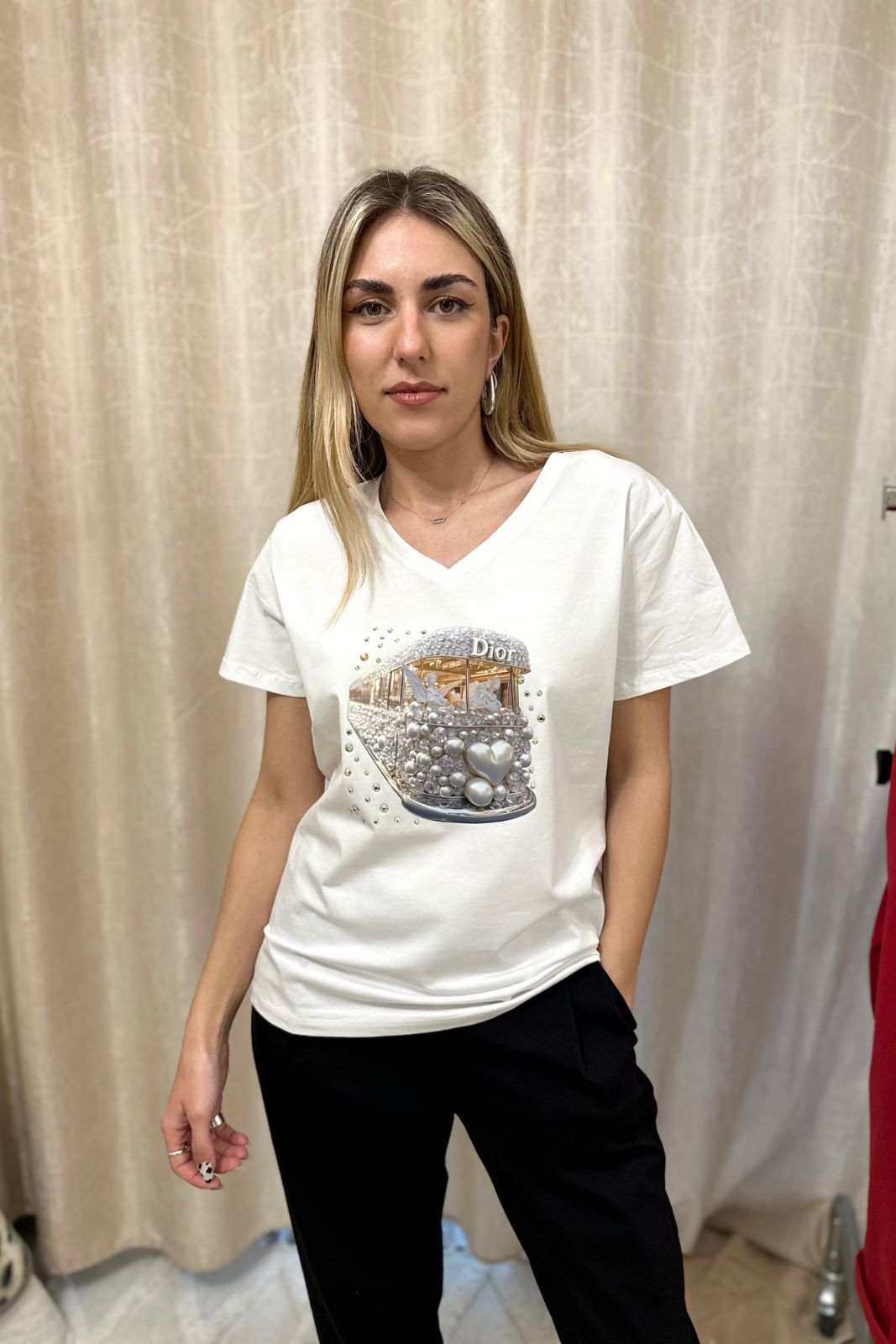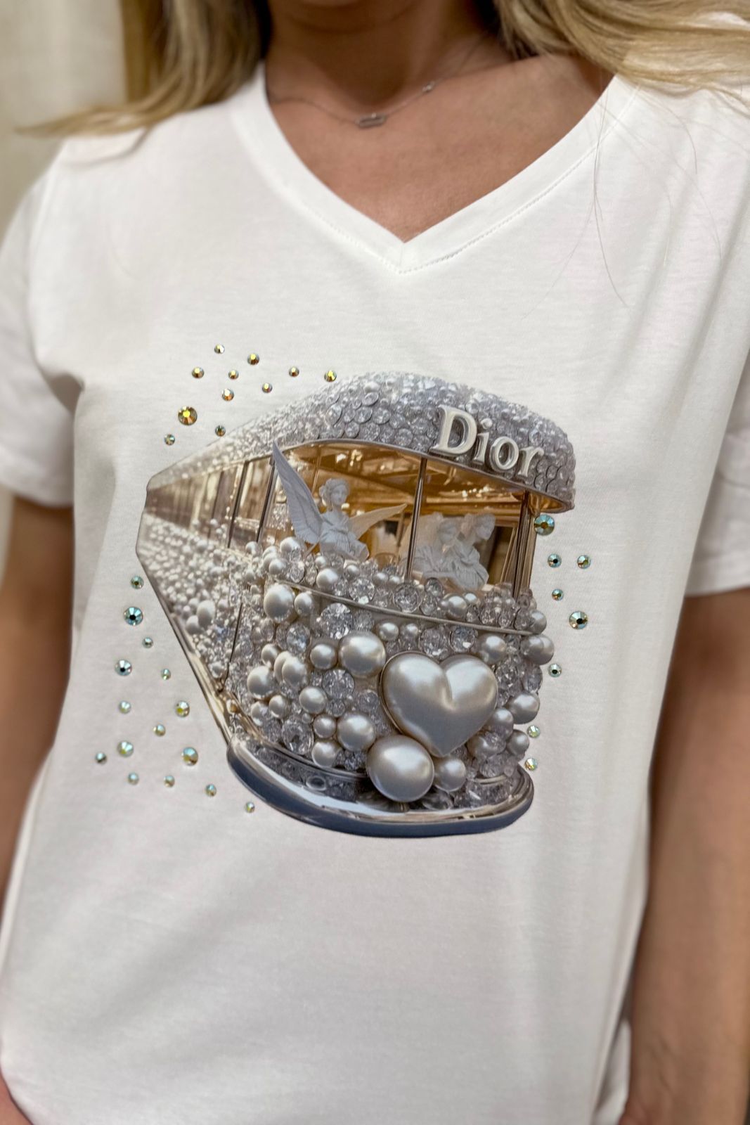Αυτή η λευκή βαμβακερή μπλούζα με κοντό μανίκι ξεχωρίζει με το τύπωμα Dior και τις λαμπερές λεπτομέρειες από κρύσταλλα Swarovski. Άνετη και δροσερή, με γραμμή που φοριέται εύκολα σε κάθε περίσταση.